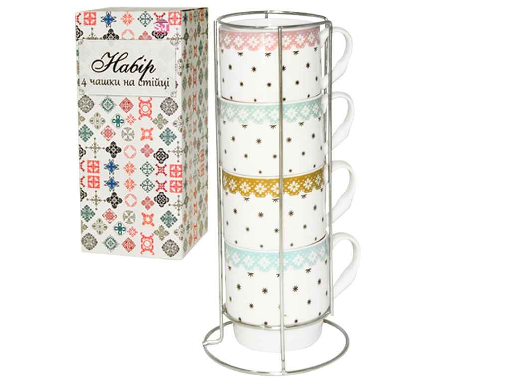 Набор чашек (4х320 мл) на металлической стойке от торговой марки S&T идеально подходит для повседневного использования. Чашки изготовлены из экологически чистого, качественного фарфора белого цвета с рисунком.