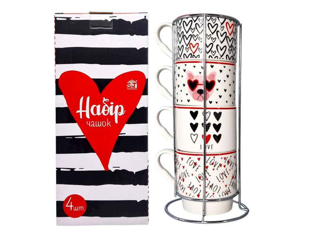 Набор чашек (4х320 мл) на металлической стойке от торговой марки S&T идеально подходит для повседневного использования. Чашки изготовлены из экологически чистого, качественного фарфора белого цвета с рисунком.
