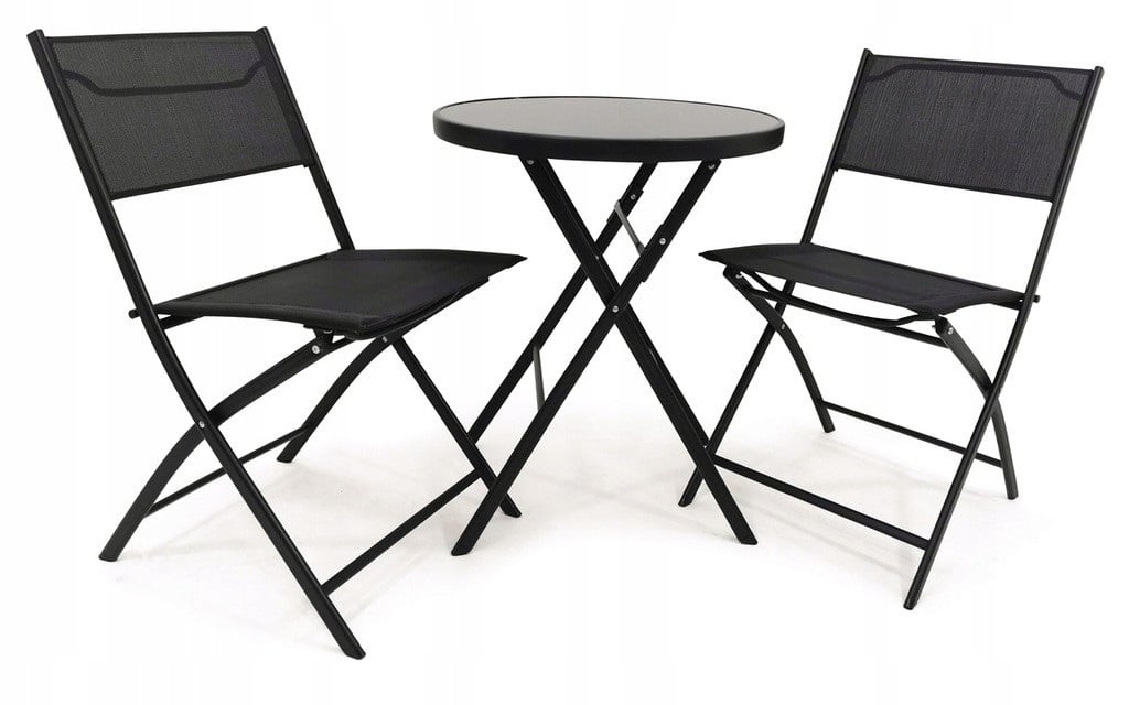 Практичный набор для балкона, террасы или сада. Каркас стула и стола изготовлен из металла, верхняя часть – из закаленного стекла, а сиденья и спинка кресла изготовлены из прочной и практичной ткани TEXTELINE.