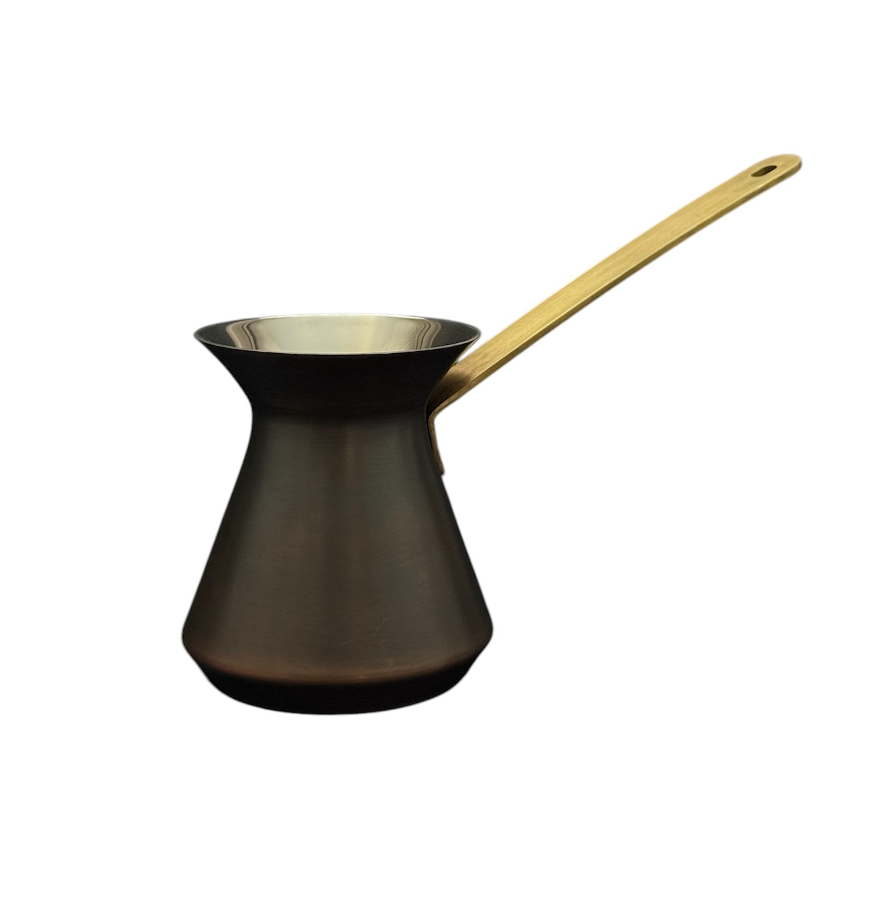 Данная модель имеет современное напыление - патина. Это напыление не только делает дизайн турки более современным, но и упрощает уход за туркой. На патине не остаются разводы и пятна. Данная модель не требует дополнительного ухода и всегда выглядит как новая.