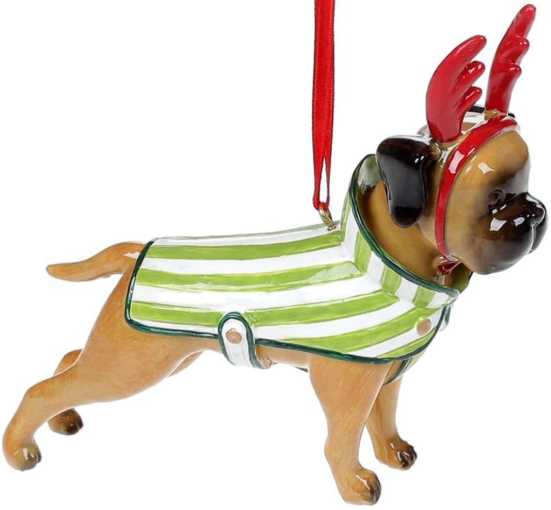 Подвесная фигурка. Материал: полистоун (искусственный камень). Размер: 12.5х3.3х10см. Фигурка представляет собой собачку с новогодним декором.