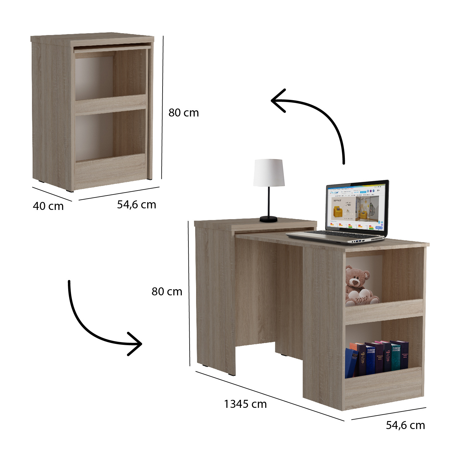 Стіл-трансформер Smart/Смарт 1Цей стіл-трансформер - ідеальне рішення для тих, хто цінує практичність та функціональність у меблях. Завдяки інноваційному дизайну, він легко трансформується, забезпечуючи зручність у використанні та ефективне використання простору.Його розміри складають 546х400х800 мм, а розкладений вигляд досягає 1345х546х800 мм, що робить його ідеальним як для невеликих, так і для більших приміщень. Виготовлений з високоякісного ЛДСП товщиною 16 мм, класу Е1, цей стіл гарантує довговічність та безпеку використання.Кришка тумби товщиною 32 мм забезпечена протиударним краєм, що збільшує його стійкість та довговічність. Механізм з шумопоглинаючими роликами та резиновими елементами забезпечує плавне та безшумне відкривання та закривання.З двома відкритими полицями, цей стіл дозволяє зручно організувати простір, зберігаючи речі поряд і легко доступними. Завдяки своїй універсальності та функціональності, цей стіл-трансформер стане невід'ємною частиною вашого домашнього або офісного інтер'єру, забезпечуючи комфорт та зручність у щоденному використанні.