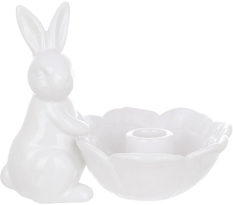 Подсвечник керамический для одной свечи (белая фигурка кролика с подставкой-цветком для свечи).