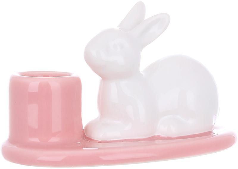 Подсвечник керамический для одной свечи с розовым основанием и фигуркой кролика.