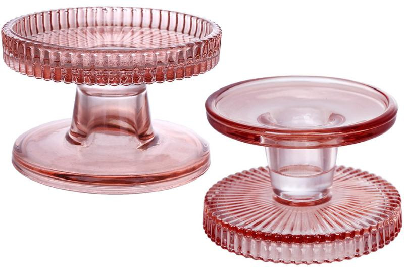 В наборе 6 подсвечников из стекла, стилизованного под резной хрусталь с нежно-розовым отливом.