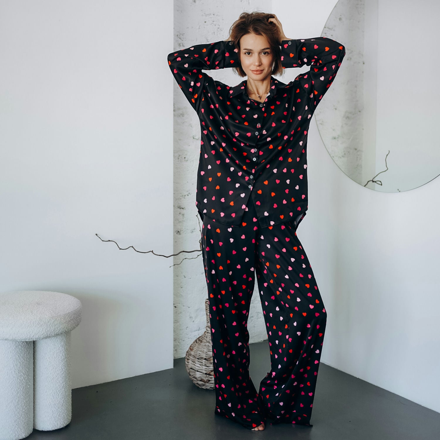 Женская пижама Amore – нежность и комфорт в каждой детали Amore – это стильная женская пижама из сатина, сочетающая утонченность, комфорт и качество. Легкая сатиновая ткань с шелковистой текстурой приятно касается кожи, обеспечивая комфортный сон и уют дома. Романтический принт с цветными сердечками придает пижаме особый шарм. Этот женский сон идеально подходит для отдыха, домашних дел и даже утреннего кофе на балконе. Что входит в комплект пижамы? Длинная рубашка на пуговицах – стильный классический крой, манжеты на рукавах, удобный силуэт. Брюки свободного кроя – легкие, комфортабельные, на мягкой резинке для идеальной посадки. Преимущества женской пижамы Amore: Сатиновая пижама для женщин – легкая, нежная к коже, не парит и хорошо пропускает воздух. Комфортная пижама с длинным рукавом – идеально подходит для любого времени года. Мягкая и приятная на ощупь – гладкий сатин с шелковой текстурой дарит ощущение нежности. Не мнеющаяся женская пижама – ткань сохраняет свой вид даже после многократной стирки. Домашний костюм для женщин – отличная альтернатива обычному халату или лосинам. Не теряющая цвет пижама – яркие сердечки остаются такими же насыщенными даже после стирки. Стильная домашняя одежда для женщин – выглядит элегантно и изысканно даже дома. Гипоаллергенная ткань – подходит для чувствительной кожи, не вызывает раздражений. Отличный подарок – романтический и практичный выбор для жены, мамы, подруги или сестры. Кому подойдет женская пижама Amore? Тем, кто ищет комфортную одежду для дома и сна. Женщинам, ценящим стильный и качественный женский комплект. Тем, кто хочет иметь женскую пижаму, которая не мнется и легко стирается. Людям с чувствительной кожей – натуральный состав ткани бережно относится к телу. Как женский комплект – стильный, нежный и комфортный. Как ухаживать за сатиновой пижамой? Стирать при температуре до 30°C в щекотливом режиме. Использовать мягкие моющие средства, не применять отбеливатели. Сушить естественным способом, избегать машинного отжима. Гладить при низкой температуре или использовать отпариватель.