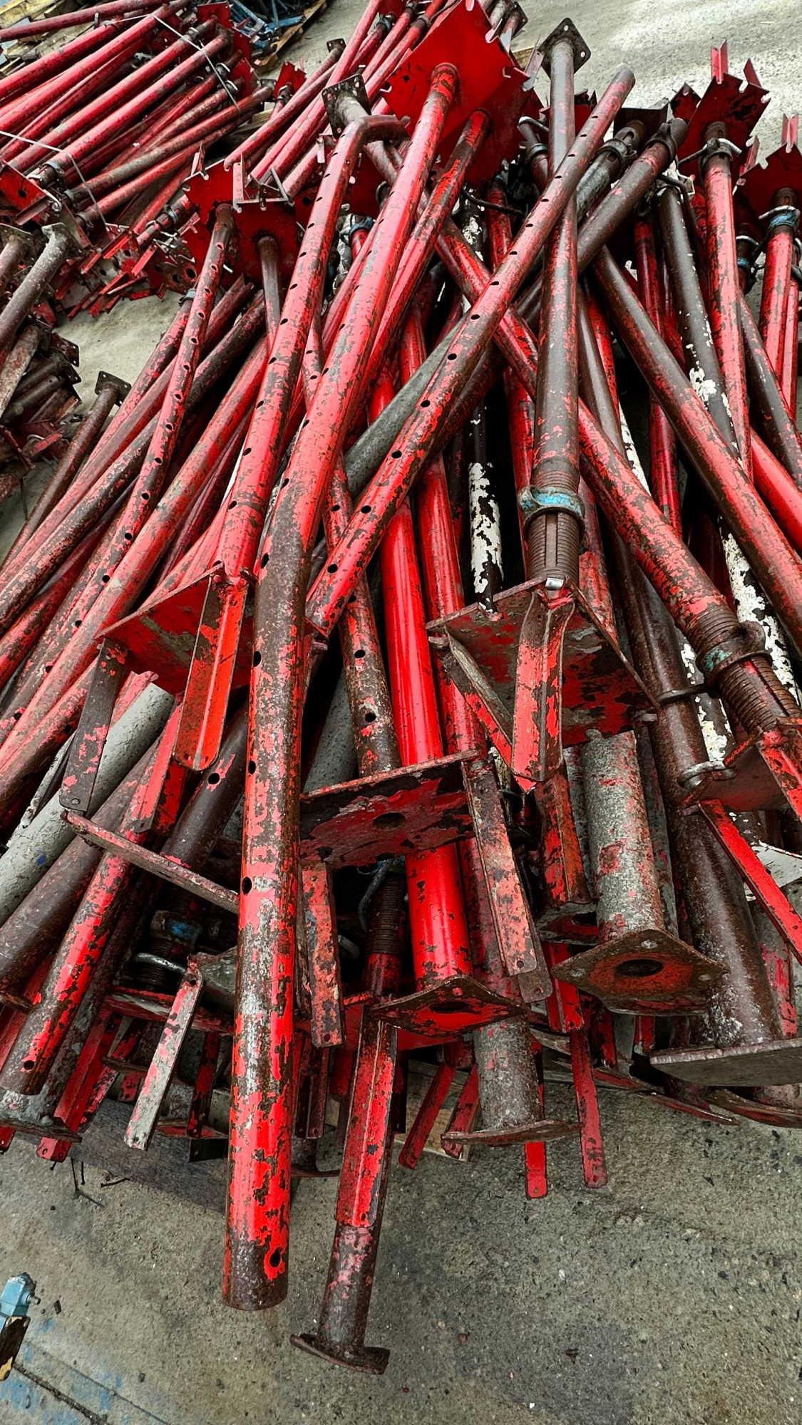 Они используются для поддержки перекрытий, балок или других горизонтальных элементов при строительстве. Стойки имеют регулируемую высоту благодаря телескопической конструкции и резьбовому механизму точной настройки. Они изготовлены из стали и окрашены в красный цвет для защиты от коррозии, хотя на изображении заметен износ. Эти элементы являются ключевым компонентом строительных лесов и систем опалубки.