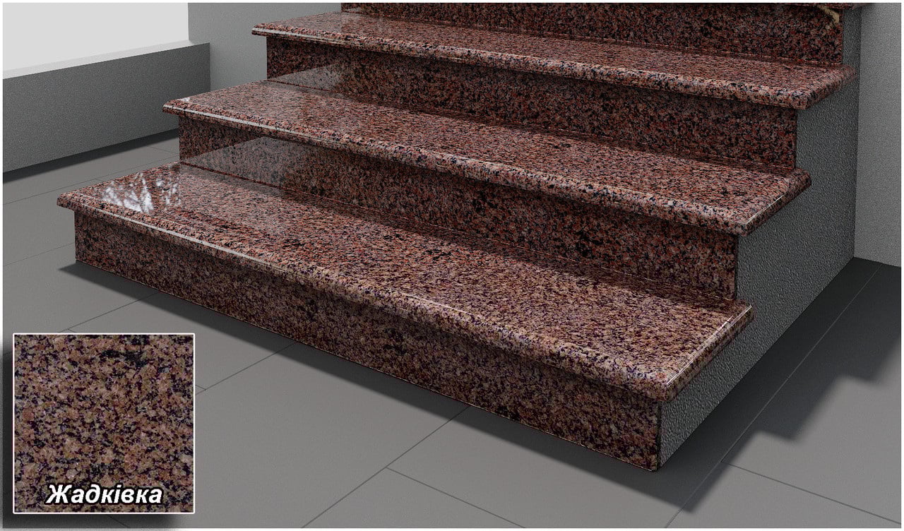 Гранітні сходинки червоного кольору. Наше підприємство, яке знаходиться в Житомирській області, виготовляє сходинки по вашим індивідуальним розмірам. Сходинки можуть бути як поліровані(як правило всередені приміщень), так і термооброблені - для використання на вулиці. Зазвичай сходинки робляться товщиною 3 см. Але по бажанню замовників ми можемо зробити їх любої товщини. Ми організуємо доставку сходинок по всій Україні попутним транспортом або Новою поштою.