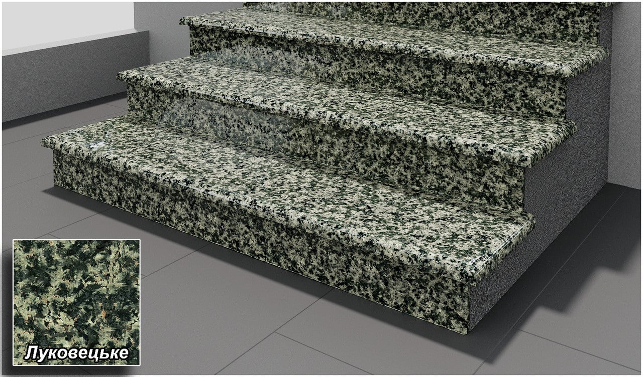 Гранітні сходинки світлого кольору. Наше підприємство, яке знаходиться в Житомирській області, виготовляє сходинки по вашим індивідуальним розмірам. Сходинки можуть бути як поліровані(як правило всередені приміщень), так і термооброблені - для використання на вулиці. Зазвичай сходинки робляться товщиною 3 см. Але по бажанню замовників ми можемо зробити їх любої товщини. Ми організуємо доставку сходинок по всій Україні попутним транспортом або Новою поштою.