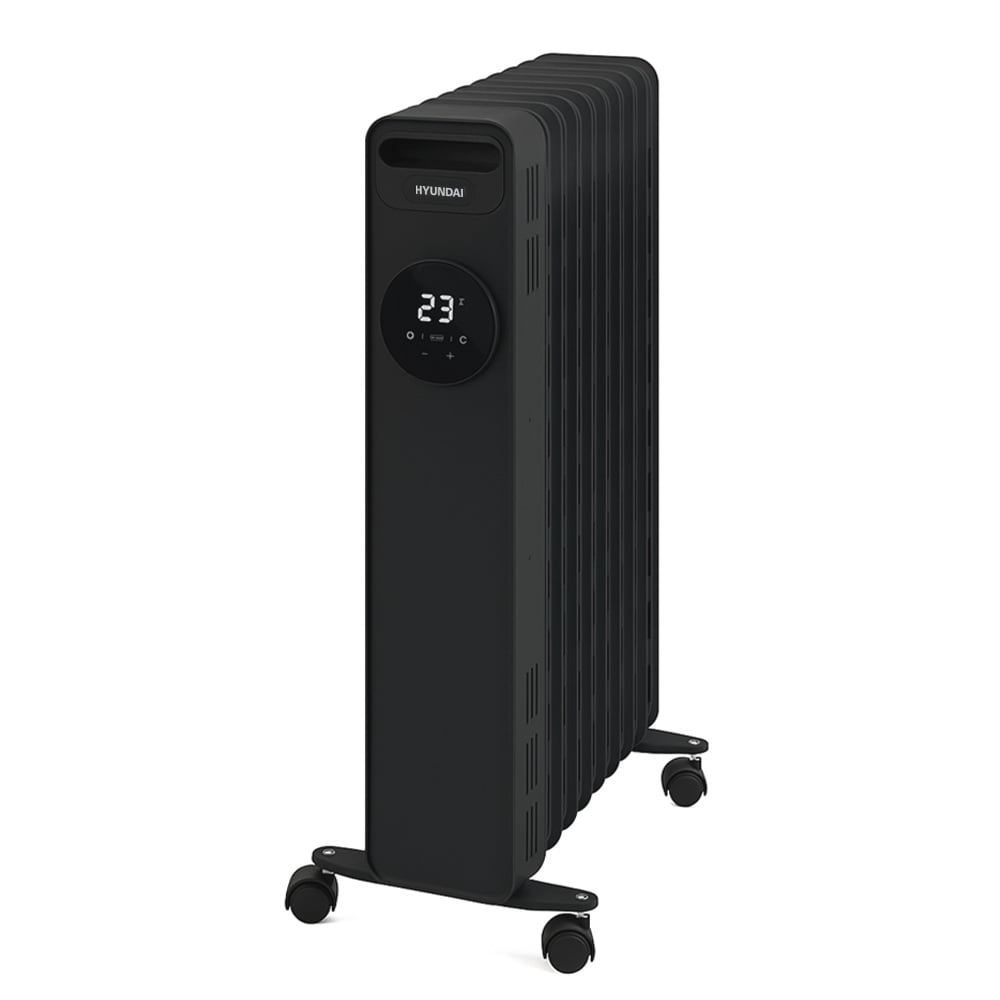 Hyundai H09HTRB – масляный обогреватель с девятью секциями, рассчитанный на эффективный обогрев помещений площадью до 20 квадратных метров. Корпус выполнен в черном цвете и устойчиво устанавливается на полу с помощью колес, что обеспечивает удобное перемещение. Электронная система управления и сенсорная панель позволяют точно задавать температуру и режимы нагрева, а встроенный термостат поддерживает стабильный уровень тепла без пересушивания воздуха.