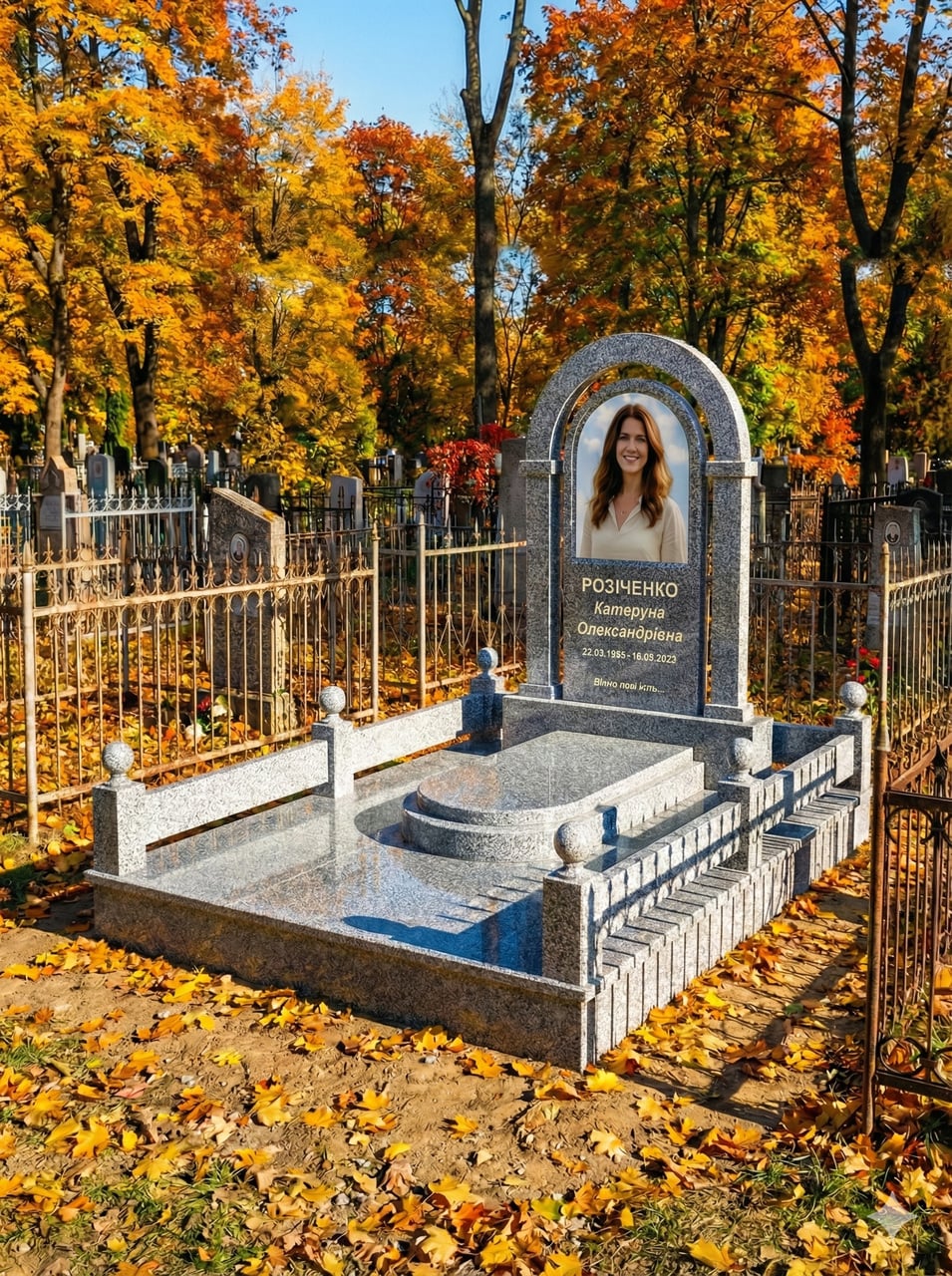 Елітний пам'ятник з сірого граніту з аркою і площадкою. Камінь може бути чорний, червоний, білий, зелений, сірий або комбінований в кількох видах каменя. Розмір 240*180 см. Згідно ваших побажань можемо вносити зміни в комплекс або за допомогою наших дизайнерів розробимо комплекс по вашим кресленням. 3д - візуалізація.