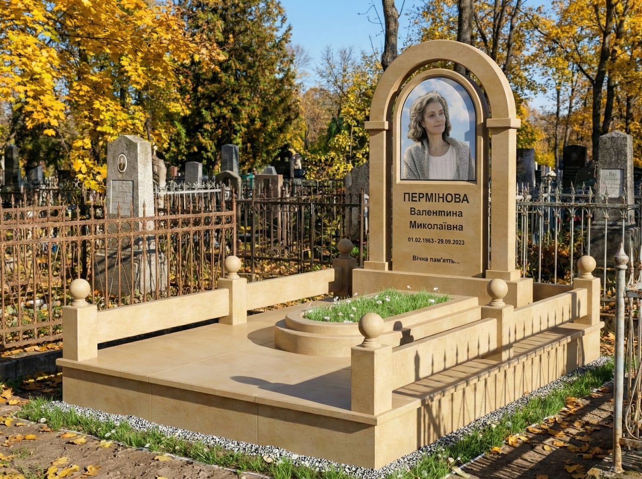Елітний пам'ятник для жінки з жовтого піщаника з аркою та майданчиком. Камінь може бути білий, світлий із розводами або жовтий. Розумна альтернатива дорогим пам'ятникам із імпортного мармуру. Розмір 240*180 см. Згідно з вашими побажаннями, можемо вносити зміни в комплекс або за допомогою наших дизайнерів розробимо комплекс за вашими кресленнями та запитами. 3д — візуалізація.