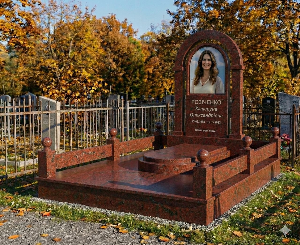 Елітний пам'ятник з червоного граніту з аркою і площадкою. Камінь може бути чорний, світлий, зелений, сірий або комбінований в кількох видах каменя. Розмір 240*180 см. Згідно ваших побажань можемо вносити зміни в комплекс або за допомогою наших дизайнерів розробимо комплекс по вашим кресленням. 3д - візуалізація.