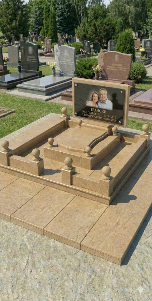 Комплекс із піщаника: жовтого, мармурового білого кольору, кольору слонової кістки. Також можливий варіант виготовлення такого пам'ятника з граніту: червоного, сірого, чорного, зеленого. Може бути з плитами всередині майданчика та відмосткою, а також варіант без плит із галькою. Розмір комплексу (без відмостки): 200*200 см. Можливе виготовлення за вашими розмірами. Наш дизайнер допоможе розробити будь-який пам'ятник з урахуванням ваших побажань. 3д — візуалізація.