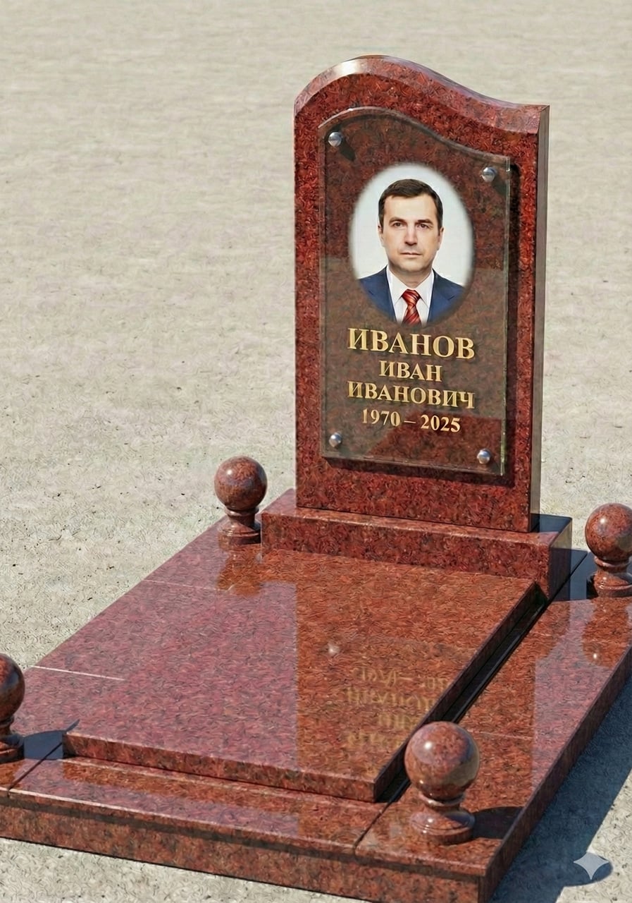 Гарний пам'ятник із червоного граніту з відмосткою. Можливо, виготовлення в сірому, чорному та зеленому граніті та світлому піщанику.