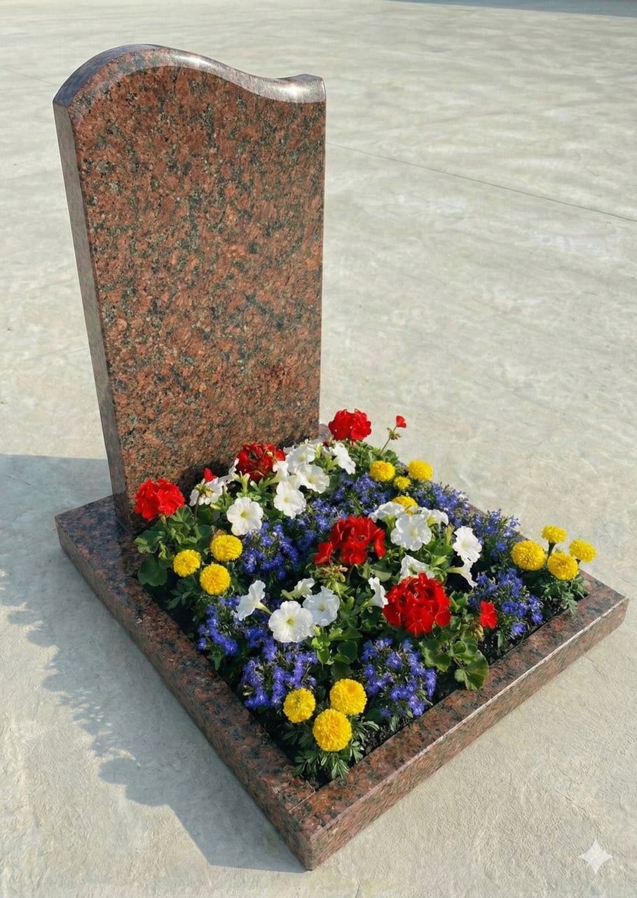 Простий пам'ятник із червоного граніту з квадратним квітником