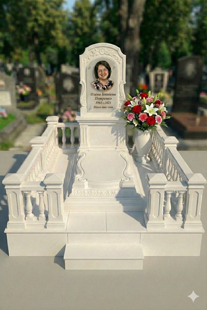 Комплекс из светлого камня с резиной стелой с площадкой и оградкой с балясинами. Камень может быть в нескольких цветах(как видно на фото): от белого до жёлтого. Размер площадки 180*220 см. Может выполнить в других размерах и изменять дизайн оградки и самой стелы, в зависимости от ваших пожеланий и размера участка.