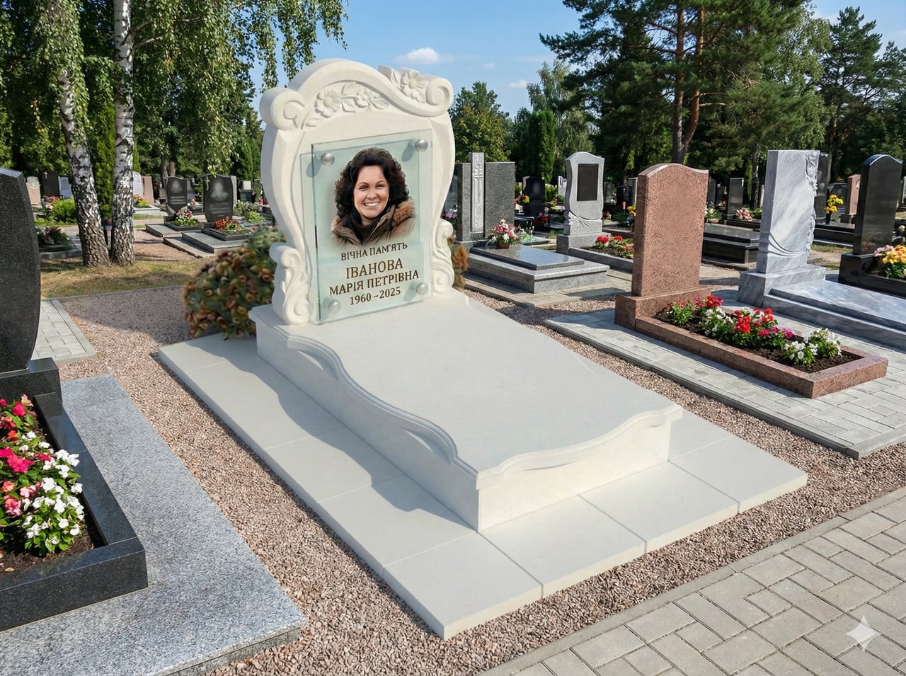 Гарний пам'ятник для жінки. Фігурна різальна невелика стела. Надгробна плита може бути також фігурною. Виготовлений у гарному мармуровому пісковику. Розумна альтернатива дорогим пам'ятникам із імпортного мармуру. Колір може бути білий, бежевий, світло-жовтий, однотонний або з легким розводом. Розмір майданчика: 140*220 см. Розмір майданчика можемо зробити будь-якої, з урахуванням розміру вашої ділянки.
