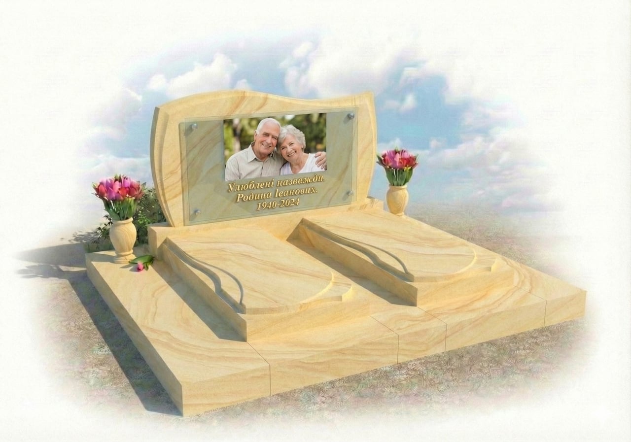 Великий майданчик 250*200. Розмір стелі 160 х 80 х 8. Виготовлений із натурального каменю пісковику. Колір каменю може бути від білого до жовтого з розводами. Чудова альтернатива дорогим пам'ятникам із імпортного мармуру. Розмір майданчика та форму стели можна змінити за вашими побажаннями та з урахуванням розміру вашої ділянки.