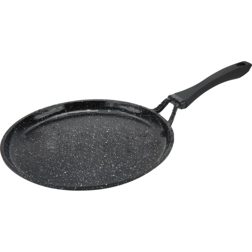 Особенности: Антипригарное покрытие Бакелитовая ручка Можно использовать на всех типах плит, в том числе индукционных Характеристики: Тип: для блинов Размер: 24 Цвет: черный Материал: литой алюминий Тип ручки: несъемная Материал ручки: бакелит Внутреннее покрытие: мраморное Индукционное дно Подходит для всех типов плит;