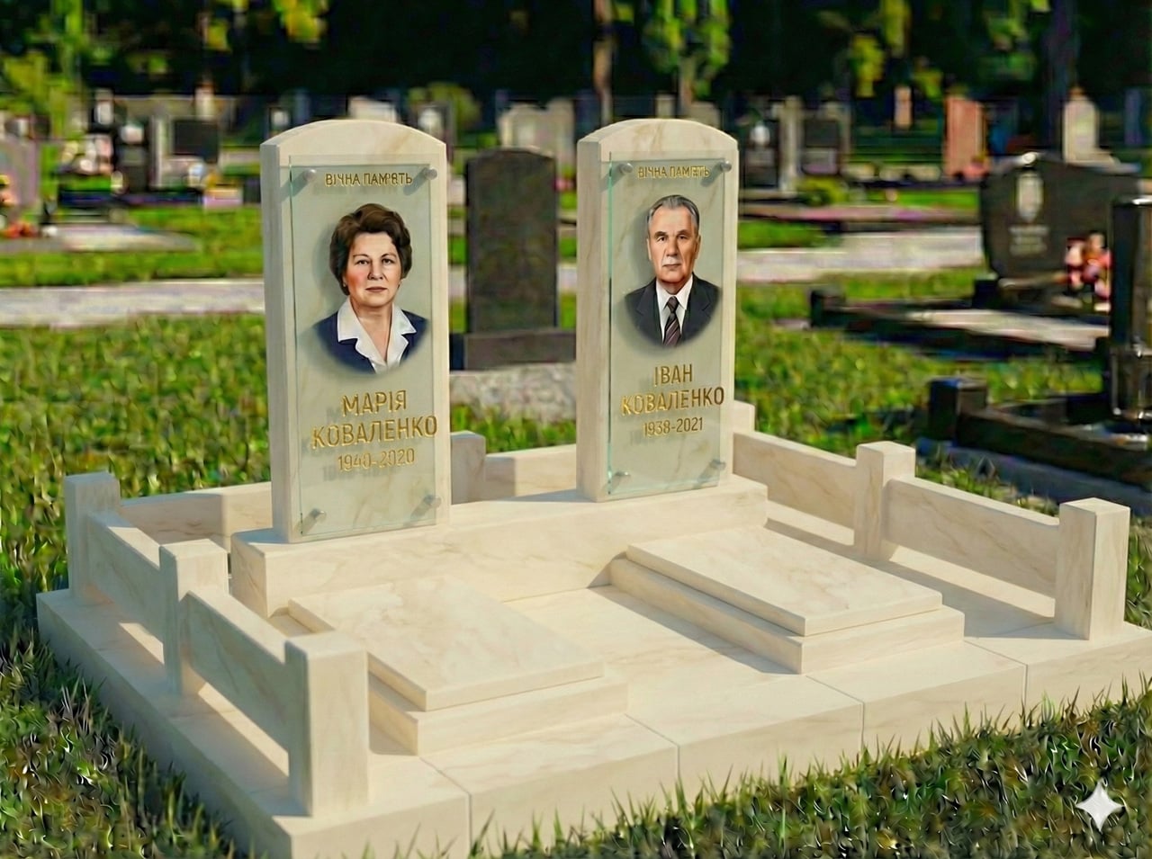 Меморіальний комплекс для двох у класичному стилі, розміром 260*200 см. Виготовлений у світлому натуральному камені пісковику. Колір може бути білим, бежевим, жовтим. Розмір стели 90*45*6. Розмір майданчика можна зробити будь-якою, з урахуванням розміру вашої ділянки. Також можемо змінити розмір і форму стелі, згідно з вашими побажаннями.