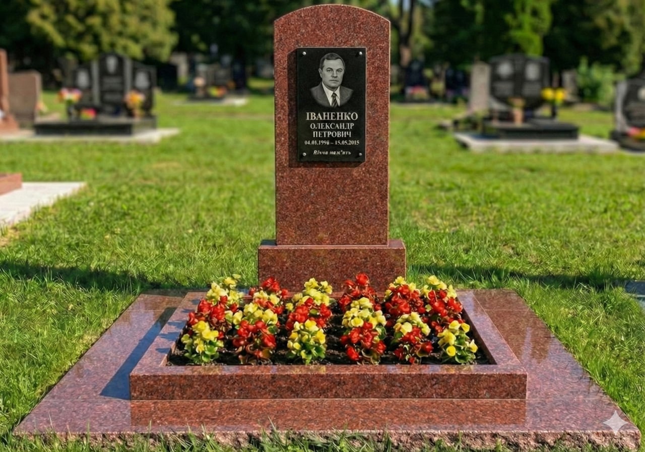 Описание Памятник с большим цветником и отмосткой красный гранит