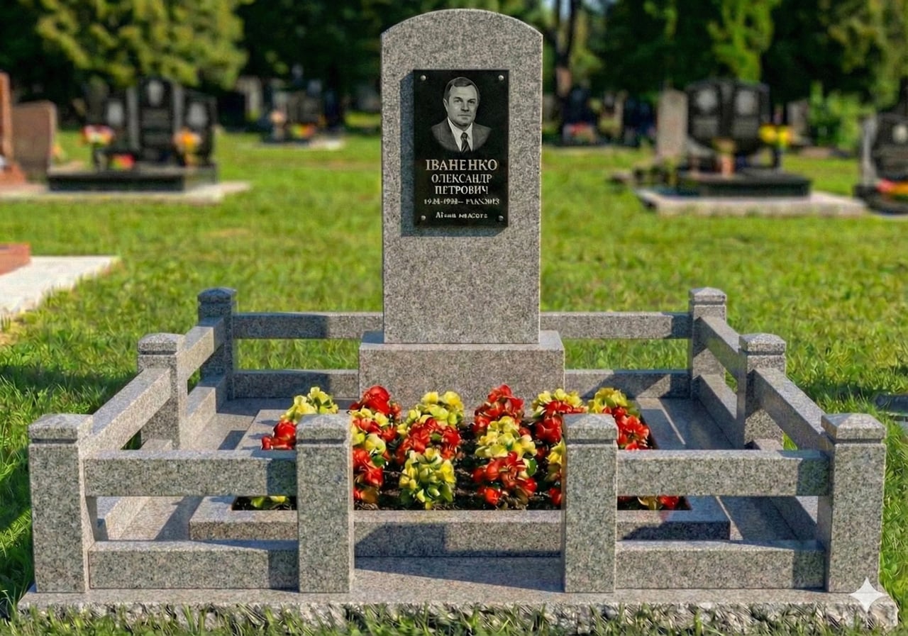 Меморіальний комплекс із майданчиком розміром 240 х 180 і огорожею. Може бути виготовлений із різних гранітів: чорного, червоного, зеленого, сірого, а також світлого піщаника. Розмір стели 120*60*8. Загальна висота пам'ятника 160 см. Може бути як із квітником, так і з надгробною плитою. Розмір майданчика та дизайн можемо виготовити, з урахуванням ваших побажань. 3д — візуалізація.