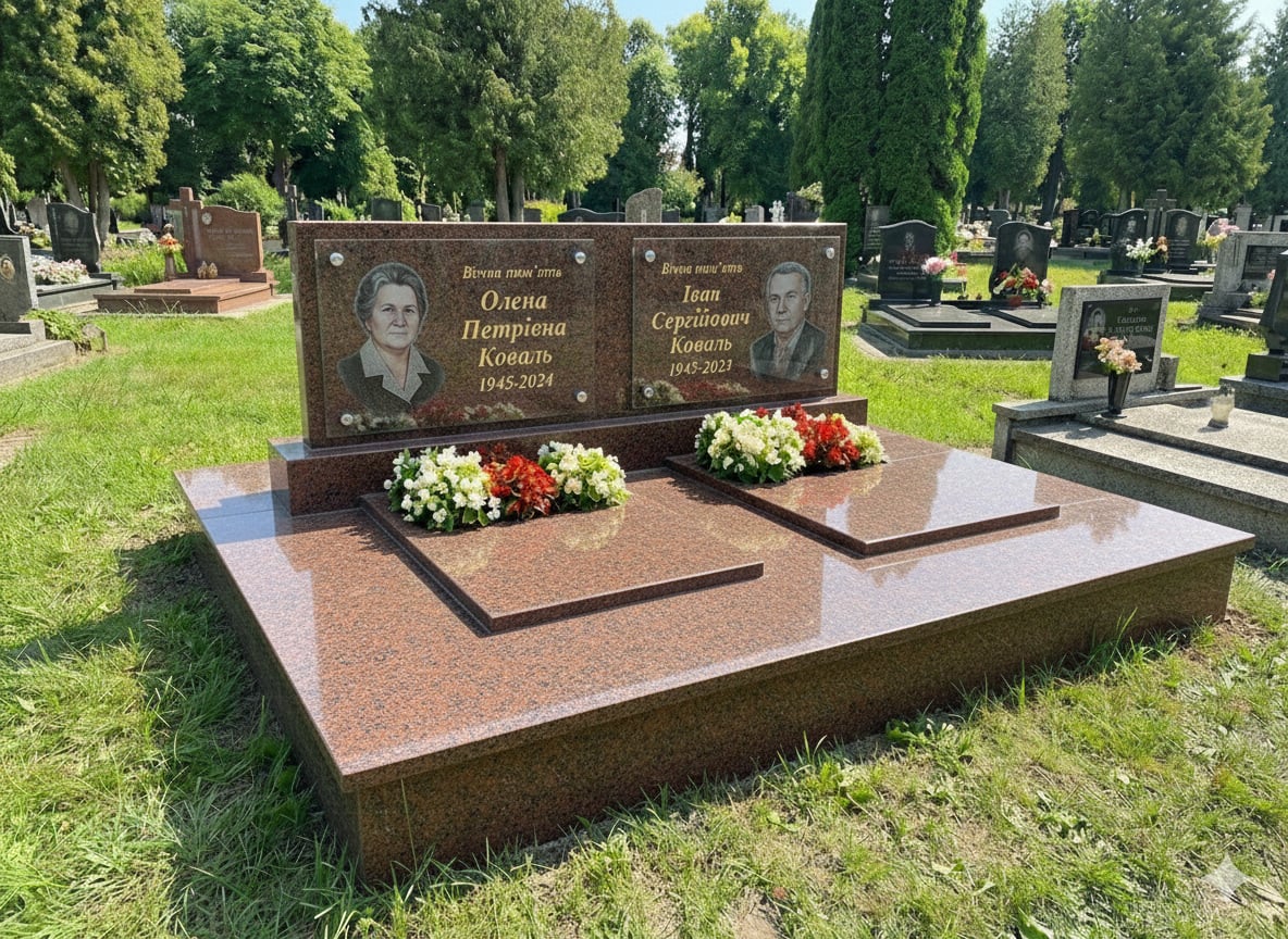 Описание Елітний подвійний пам'ятник із великим майданчиком червоний граніт
