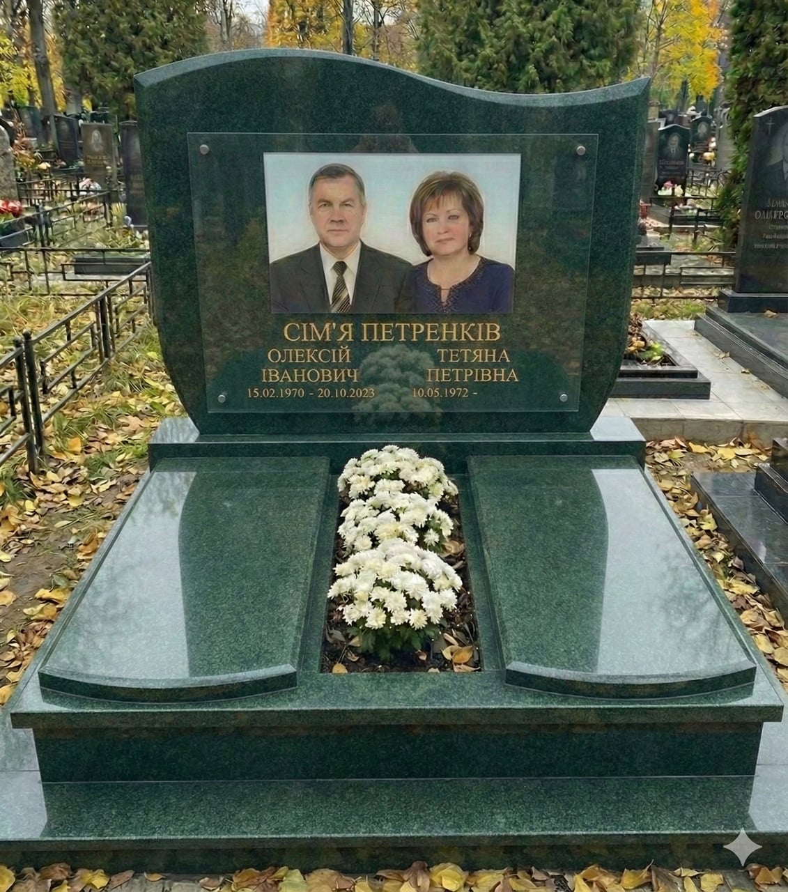 Описание Подвійний пам'ятник із горизонтальною стелою й відмосткою зелений граніт