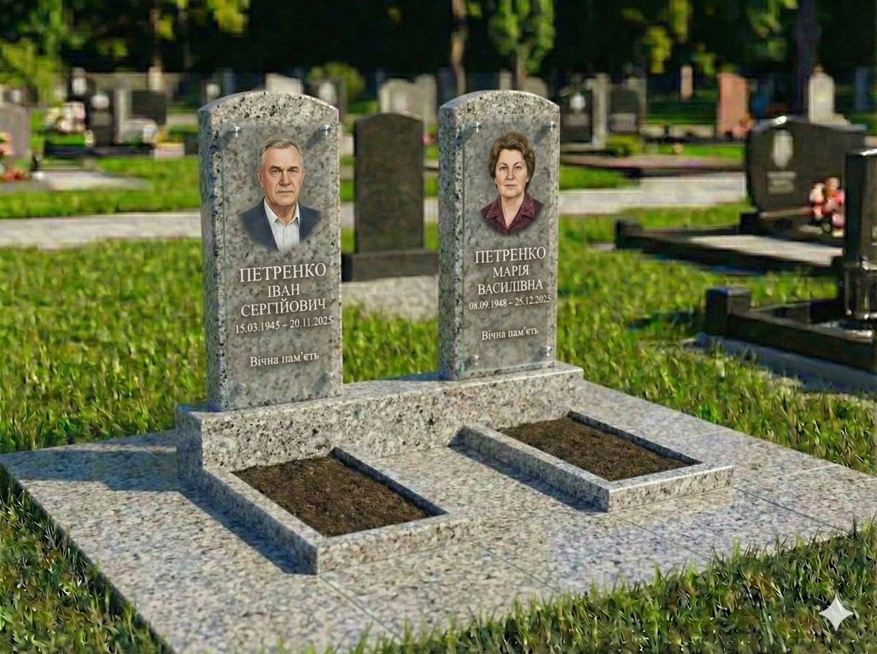 Класичний подвійний пам'ятник із квітником і майданчиком. Пам'ятник може бути виготовлений із чорного, червоного, сірого або зеленого граніту, а також зі світлого піщаника. Розмір майданчика 260*200 см. Додатково може комплектуватися надгробними плитами. Можна зробити розмір майданчика іншою, також можливо змінити форму стелі з урахуванням ваших побажань.