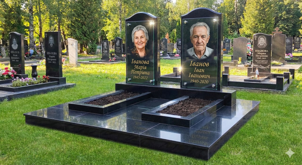 Класичний подвійний пам'ятник із квітником і майданчиком. Пам'ятник може бути виготовлений із чорного, червоного, сірого або зеленого граніту, а також зі світлого піщаника. Розмір майданчика 260*200 см. Додатково може комплектуватися надгробними плитами. Можна зробити розмір майданчика іншою, також можливо змінити форму стелі з урахуванням ваших побажань.