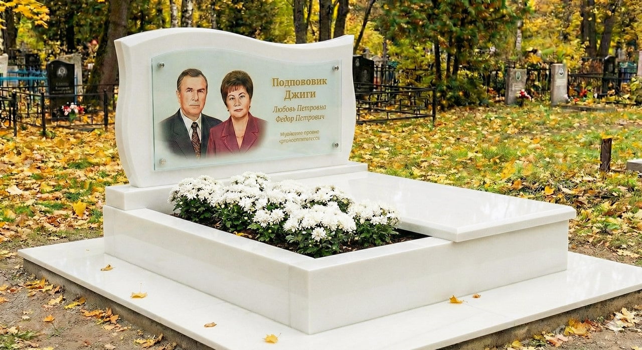 Описание Подвійний горизонтальний пам'ятник із квітником і відмосткою з білого каменю