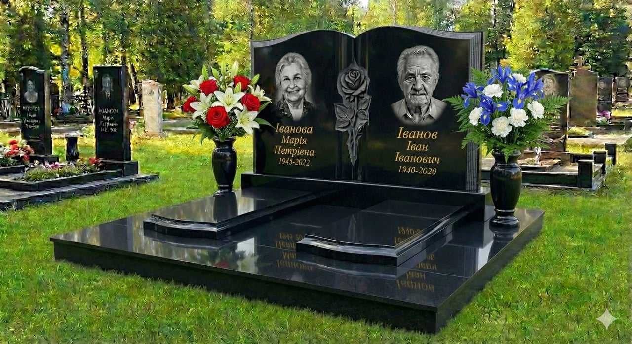Описание Подвійний пам'ятник "книга" з майданчиком із чорного граніту