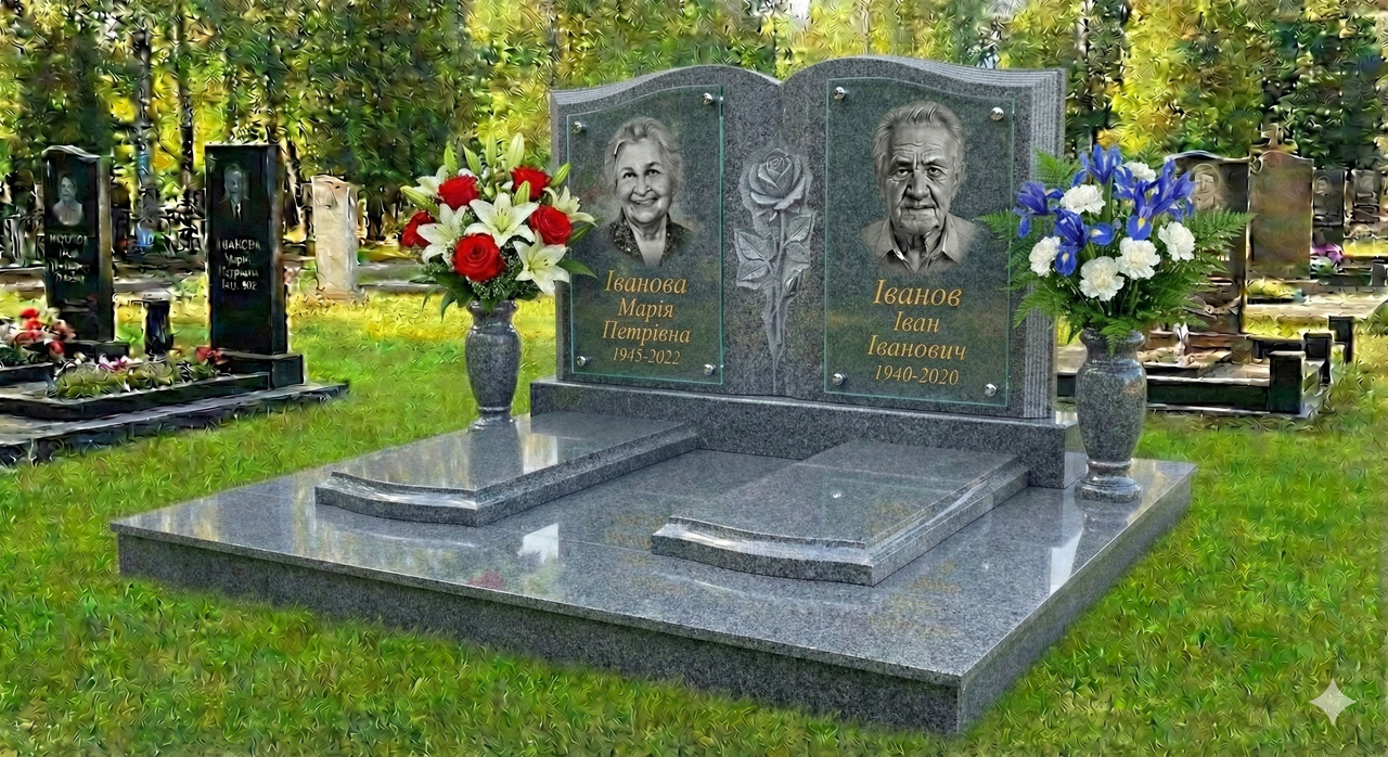 Елітний комплекс розміром 240*200 см. Стелла виготовлена у формі книги. Її розмір 160х80х10. Пам'ятник може бути виготовлений із чорного, червоного, зеленого або сірого граніту. Розмір майданчика та дизайн пам'ятника можемо зробити з урахуванням ваших побажань.