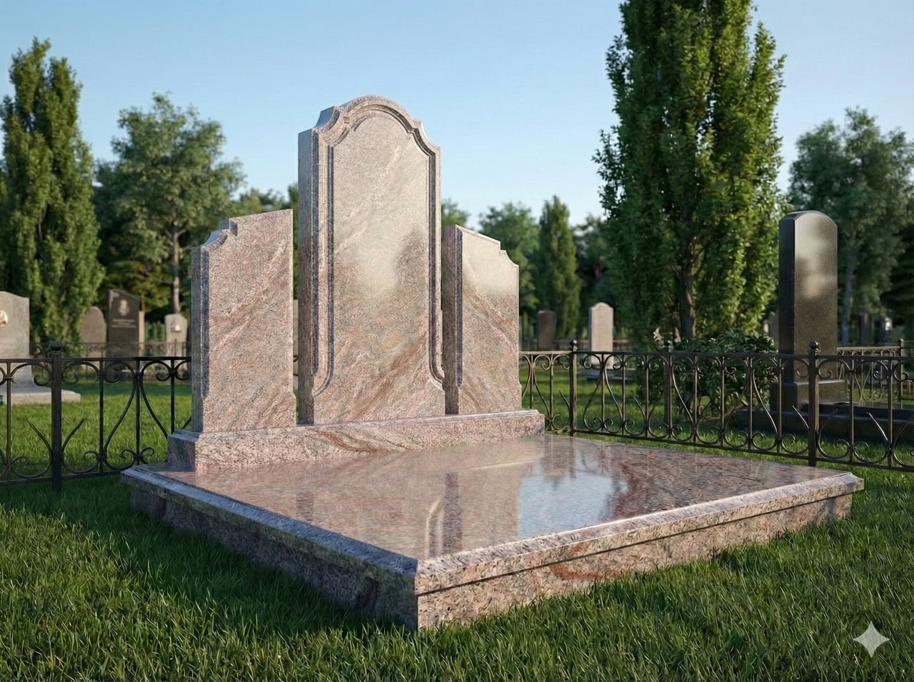 Розмір комплексу 280*240 см. Виготовлений із красивого сірого граніту Гранат. Також цей комплекс може бути виготовлений із чорного, червоного, зеленого граніту та світлого піщаника або їх комбінацій. Можна внести зміни в дизайн і розмір пам'ятника з урахуванням ваших побажань. Надаємо послуги дизайнера. 3д — візуалізація.