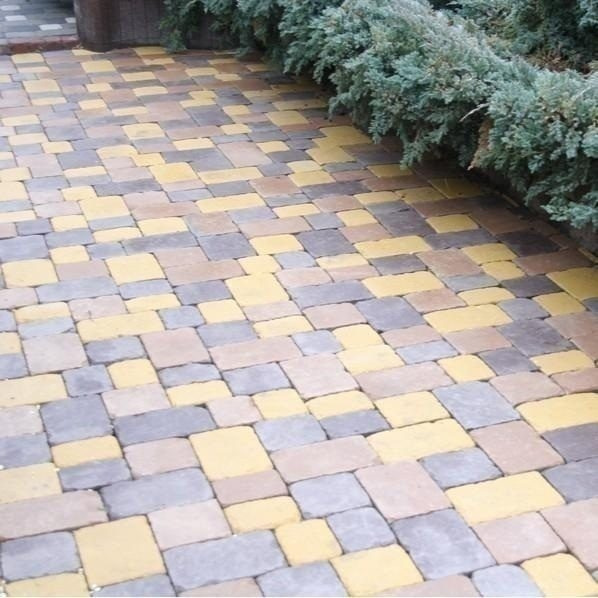 Длина: 160 мм. Ширина: 120...240 мм. Толщина: 60 мм. Тротуарная плитка Золотой Мандарин Плац 160х60 мм желтый на сером цементе характеризуется стойкостью к воздействию солнечных лучей, не плавится на солнце