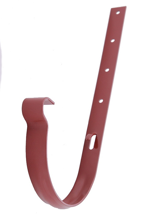 Призначений для кріплення ринви до покрівельної конструкції і завдання необхідного ухилу водостічної системи в цілому. Виготовлений з високоякісної сталі з шаром оцинковки в 275 г/м2, що дозволяє попередити прояви коррозії протягом строку експлуатації. Посилена з усіх сторін конструкція дозволяє утримувати вагу до 100 кг одним держаком. Крюки для кріплення ринви з обох сторін дають можливість легко змонтувати систему і, за необхідності, без зусиль замінити ринву. Довгий металевий кронштейн ринви слід обирати в тому випадку, якщо на покрівлі ще не встановлений покрівельний матеріал або відсутня лобова дошка. Кожен металевий кронштейн водостічної системи монтується на обрешітку на 3 покрівельних саморіза. Відстань між держаками має бути не більше ніж 50 см, або 20 см до краю лобової дошки. Для попередження застою води у системі і забезпечення ефективного відводу дощової води, під час проведення монтажних робіт, слід організувати ухил ринви у напрямі зливу води через водостічну лійку. Величина нахилу повинна складати 3-5 мм на 1 метр погонний.