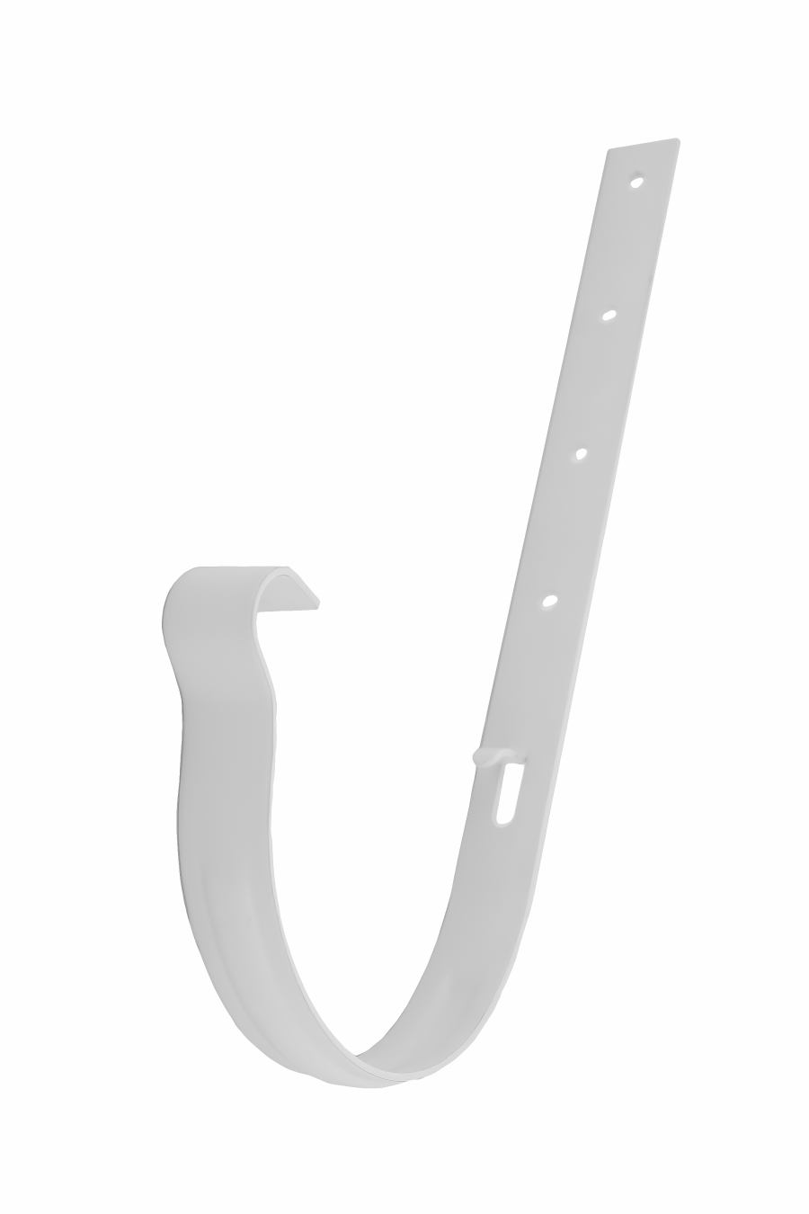Призначений для кріплення ринви до покрівельної конструкції і завдання необхідного ухилу водостічної системи в цілому. Виготовлений з високоякісної сталі з шаром оцинковки в 275 г/м2, що дозволяє попередити прояви коррозії протягом строку експлуатації. Посилена з усіх сторін конструкція дозволяє утримувати вагу до 100 кг одним держаком. Крюки для кріплення ринви з обох сторін дають можливість легко змонтувати систему і, за необхідності, без зусиль замінити ринву. Довгий металевий кронштейн ринви слід обирати в тому випадку, якщо на покрівлі ще не встановлений покрівельний матеріал або відсутня лобова дошка. Кожен металевий кронштейн водостічної системи монтується на обрешітку на 3 покрівельних саморіза. Відстань між держаками має бути не більше ніж 50 см, або 20 см до краю лобової дошки. Для попередження застою води у системі і забезпечення ефективного відводу дощової води, під час проведення монтажних робіт, слід організувати ухил ринви у напрямі зливу води через водостічну лійку. Величина нахилу повинна складати 3-5 мм на 1 метр погонний.