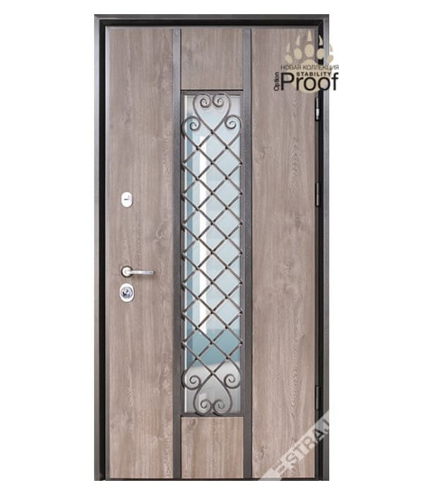 Компания «Страж» - украинское предприятие европейского уровня, которое уже 17 лет занимается изготовлением высококачественных дверей для частных домов и городских квартир. Компания постоянно обновляет модельный ряд, регулярно участвует в специализированных выставках, развивается и повышает качество своих изделий. Компания «Страж» использует только самые современные технологии, качественные материалы, высококлассную фурнитуру, замки от зарекомендовавших себя итальянских и российских производителей, а также авторский декор – кованые элементы и витражное стекло.На сегодняшний день ТМ «Страж» предлагает покупателям широчайший модельный ряд входных дверей – от бюджетных изделий – до серий премиум-класса. Входные двери «Страж» - это оптимальное соотношение цены и качества, индивидуальный подход к каждому клиенту и высочайший уровень сервиса.Компания «Страж» представляет новую коллекцию входных уличных дверей Stability PROOF. Особенностью конструкции является специализированный стальной лист с покрытием ПВХ "Винорит", который изготовлен на основе оцинкованного плоского проката, толщиной 1,2 мм., при толщине покрытия цинка 230 г./кв.м. Ламинированый стальной лист изготавливается компанией Страж методом кашированния на автоматизированной производственной линии европейского производства. Процесс происходит под воздействием давления, температуры и термохимический реакции. В результате покрытие обладает высокими эксплуатационными свойствами.Входные двери Stability PROOF устойчивы к перепадам температур, агрессивным климатическим воздействиям и ультрафиолетовым лучам. В конструкции дверного полотна предусмотрен термомост, что препятствует появлению конденсата, при разнице температур. Надежная входная дверь Stability PROOF станет гарантом безопасности вашего дома.