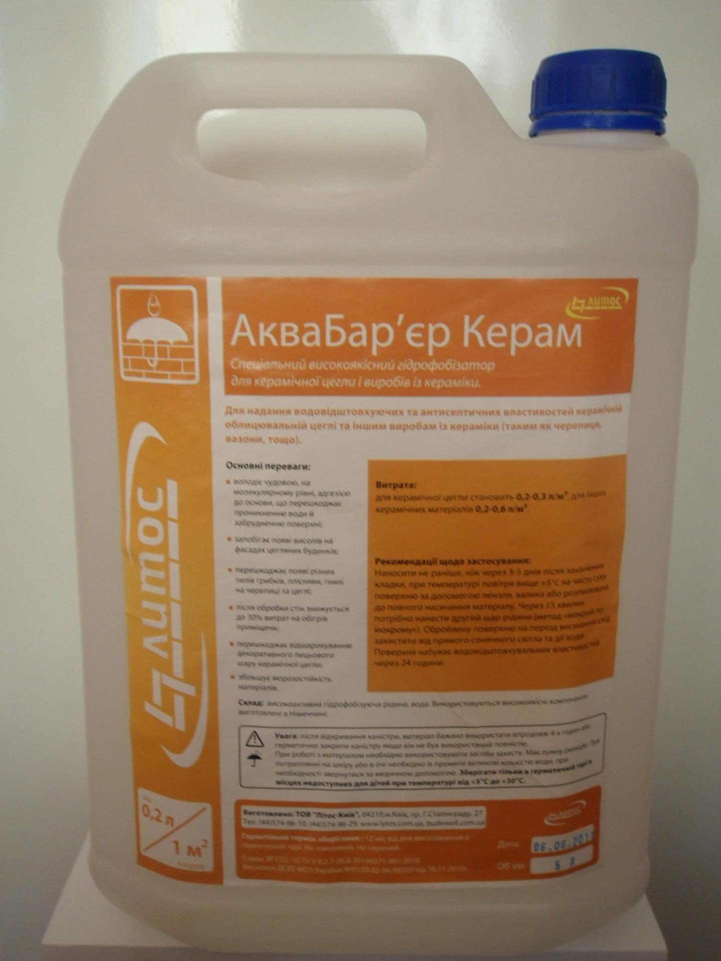 Аквабарьер Керам. Пропитка для кирпича "Аквабарьер Керам" – специальный качественный гидрофобизатор, предназначенный для обработки разных видов керамического кирпича и других керамических изделий. "Аквабарьер Керам" используется для водоотталкивающих и антисептических качеств керамике. После обработки строительных материалов пропиткой "Аквабарьер Керам": - Существенно уменьшается водопоглощение и загрязнение поверхности. - Увеличивается морозостойкость керамики. - Поверхность приобретает антисептические качества, предупреждающие образование грибков. - После обработки стен на 30% снижаются затраты на обогрев помещений. - Обработанный керамический кирпич становится устойчив к появлению высолов. - Повышается защита кирпича и керамических изделий от отслоения. - Сохраняется паропроницаемость стен. - Здание защищается от старения. Обрабатывать поверхность не раньше чем после 3-5 дней после окончания кладки, при температуре воздуха выше +5 на чистую сухую поверхность с помощью кисточки, валика или распылителя до полного насыщения материала. По истечению 15 минут нужно нанести второй слой вещества (метод «мокрый» по «мокрому»). Поверхность приобретает водоотталкивающие свойства в течении 24 часов. Расход для обработки: для облицовочного кирпича 0,2 – 0,3 л на метр квадратный, для других керамических материалов 0,2 – 0,6 на метр квадратный. Объем: 5 литров.
