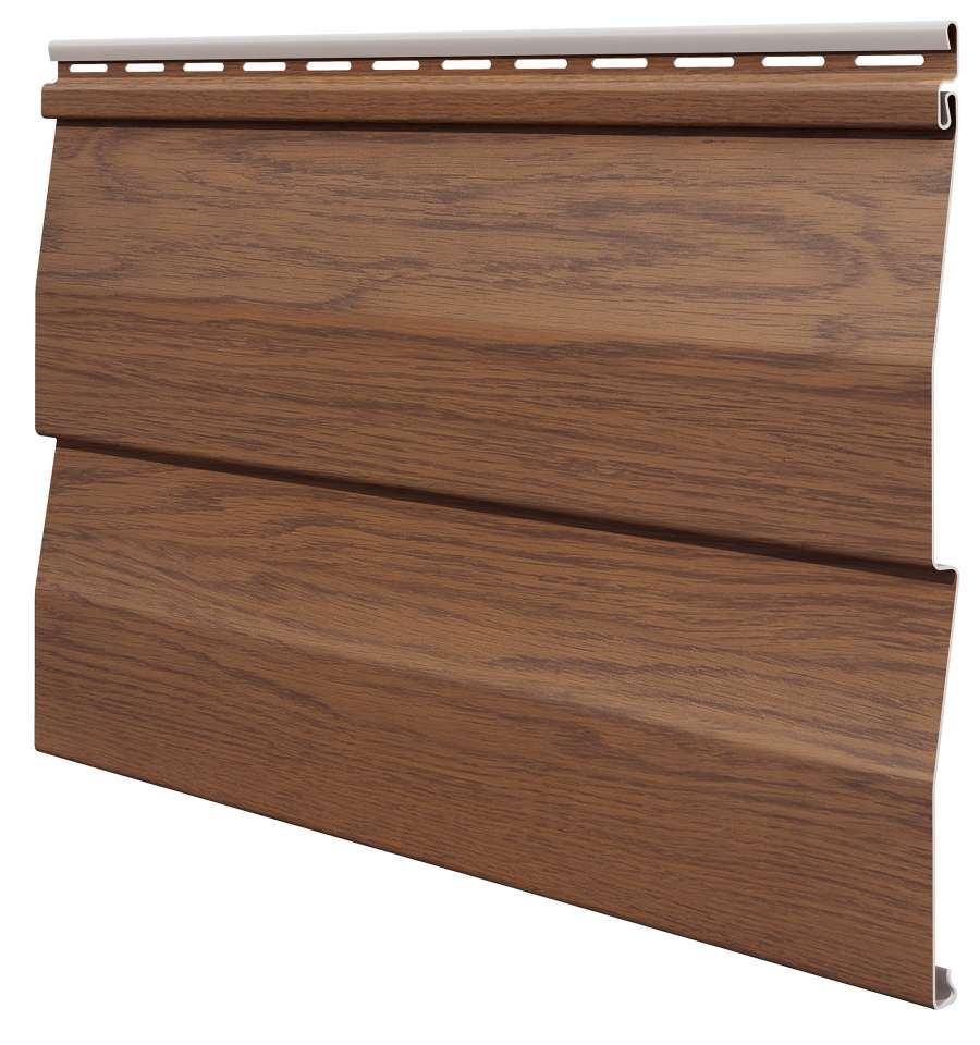 Панель сайдингу з полівінілхлориду у вигляді корабельного брусу з текстурою під дерево. Такий будівельний матеріал застосовують для реконструкції та облицювання фасадів. Гарантія в 25 років розповсюджується на вигоряння і механічну стійкість сайдингу та підтверджує якість і довговічність товару. Стінову панель виготовляють методом співплавлення двох різних мас пластику, від чого у вінілового сайдингу є дві поверхні – зовнішня та внутрішня. Зовнішня поверхня сайдингу відповідає за взаємодію з навколишнім середовищем, її склад протистоїть вигорянню, викривленню панелей, здуттю та лущенню поверхні. Внутрішня відповідає за жорсткість конструкції; від якості тієї поверхні залежить, як буде поводитися сайдинг під час зміни температур та при механічному впливі. Зображення наноситься на панель за допомогою унікальної технології термодруку, яка дозволяє ідеально передати текстуру і колір справжньої деревини. Антиураганний замок запобігає пошкодженню панелі під час екстремальних погодних умов. Панель має рівень горючості Г2 (не підтримує горіння) завдяки чому є безпечною для використання на фасаді будинку. Простота установки дозволяє провести монтаж на фасад без залучення спеціалістів з будівництва.