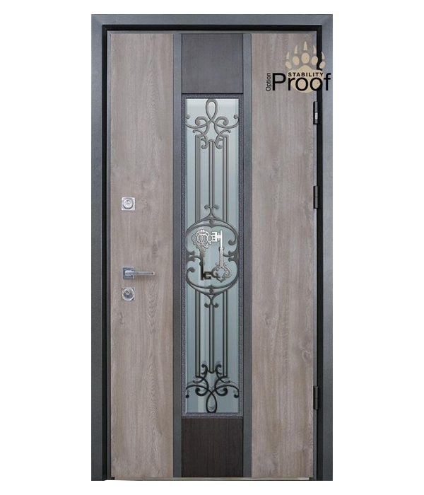 Компания «Страж» - украинское предприятие европейского уровня, которое уже 19 лет занимается изготовлением высококачественных дверей для частных домов и городских квартир. Компания постоянно обновляет модельный ряд, регулярно участвует в специализированных выставках, развивается и повышает качество своих изделий. Компания «Страж» использует только самые современные технологии, качественные материалы, высококлассную фурнитуру, замки от зарекомендовавших себя итальянских и российских производителей, а также авторский декор – кованые элементы и витражное стекло.На сегодняшний день ТМ «Страж» предлагает покупателям широчайший модельный ряд входных дверей – от бюджетных изделий – до серий премиум-класса. Входные двери «Страж» - это оптимальное соотношение цены и качества, индивидуальный подход к каждому клиенту и высочайший уровень сервиса.Компания «Страж» представляет новую коллекцию входных уличных дверей Stability PROOF. Особенностью конструкции является специализированный стальной лист с покрытием ПВХ "Винорит", который изготовлен на основе оцинкованного плоского проката, толщиной 1,2 мм., при толщине покрытия цинка 230 г./кв.м. Ламинированый стальной лист изготавливается компанией Страж методом кашированния на автоматизированной производственной линии европейского производства. Процесс происходит под воздействием давления, температуры и термохимический реакции. В результате покрытие обладает высокими эксплуатационными свойствами.Входные двери Stability PROOF устойчивы к перепадам температур, агрессивным климатическим воздействиям и ультрафиолетовым лучам. В конструкции дверного полотна предусмотрен термомост, что препятствует появлению конденсата, при разнице температур. Надежная входная дверь Stability PROOF станет гарантом безопасности вашего дома.