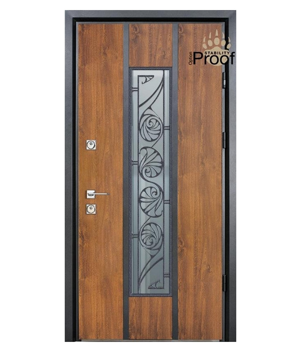 Компания «Страж» - украинское предприятие европейского уровня, которое уже 19 лет занимается изготовлением высококачественных дверей для частных домов и городских квартир. Компания постоянно обновляет модельный ряд, регулярно участвует в специализированных выставках, развивается и повышает качество своих изделий. Компания «Страж» использует только самые современные технологии, качественные материалы, высококлассную фурнитуру, замки от зарекомендовавших себя итальянских и российских производителей, а также авторский декор – кованые элементы и витражное стекло.На сегодняшний день ТМ «Страж» предлагает покупателям широчайший модельный ряд входных дверей – от бюджетных изделий – до серий премиум-класса. Входные двери «Страж» - это оптимальное соотношение цены и качества, индивидуальный подход к каждому клиенту и высочайший уровень сервиса.Компания «Страж» представляет новую коллекцию входных уличных дверей Stability PROOF. Особенностью конструкции является специализированный стальной лист с покрытием ПВХ "Винорит", который изготовлен на основе оцинкованного плоского проката, толщиной 1,2 мм., при толщине покрытия цинка 230 г./кв.м. Ламинированый стальной лист изготавливается компанией Страж методом кашированния на автоматизированной производственной линии европейского производства. Процесс происходит под воздействием давления, температуры и термохимический реакции. В результате покрытие обладает высокими эксплуатационными свойствами.Входные двери Stability PROOF устойчивы к перепадам температур, агрессивным климатическим воздействиям и ультрафиолетовым лучам. В конструкции дверного полотна предусмотрен термомост, что препятствует появлению конденсата, при разнице температур. Надежная входная дверь Stability PROOF станет гарантом безопасности вашего дома.