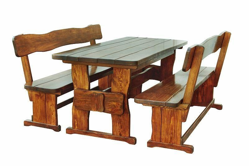 Большой комплект.Размер стола 2000х800х770 мм.Размер лавочки 2000х370х450 мм.Материал: сосна.Толщина конструктивных частей 42 мм.Обработка французским водным лаком Хело 90. Цвет тик, сосна, дуб, ольха, венге и другие.Возможно изготовление из дуба, ольхи, ясеня и других пород древесины.