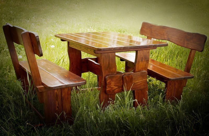 Размер стола 1800х800х770 мм. Размер лавочки 1800х370х450 мм. Материал сосна. Толщина конструктивных частей 42 мм. Обработка французским водным лаком Хело 90. Цвет тик, сосна, дуб, ольха, венге и другие. Возможно изготовление из дуба, ольхи, ясеня и других пород древесины.