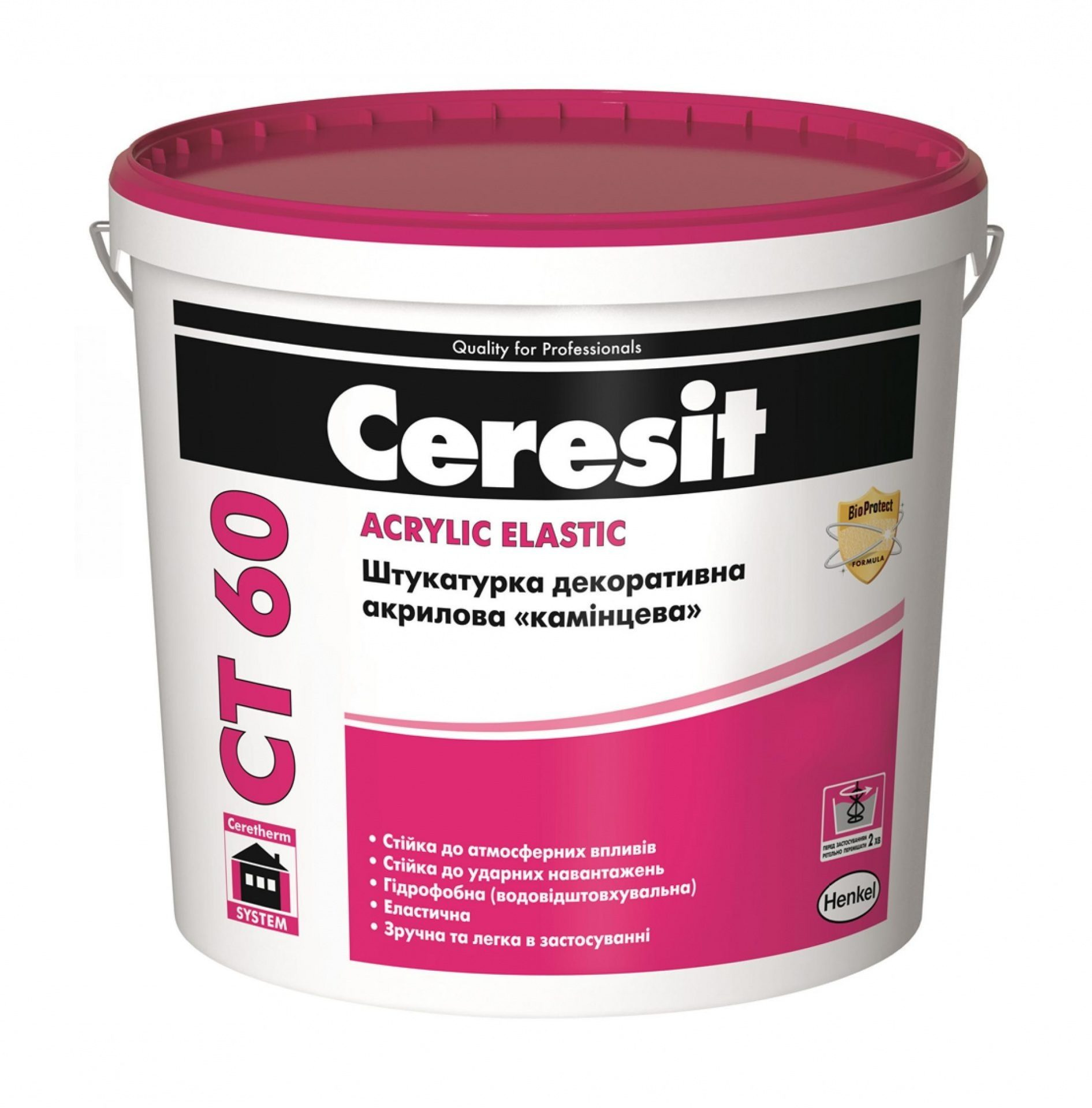 Фактура: камешек. Фасовка: 25 кг. Расход: 2.5 кг/м2. Штукатурка декоративная Ceresit CT 60 акриловая камешковая 1,5 мм База C 25 кг прозрачная - это очень простой в нанесении отделочный материал. Позволяет создать декоративный слой на криволинейных поверхностях.