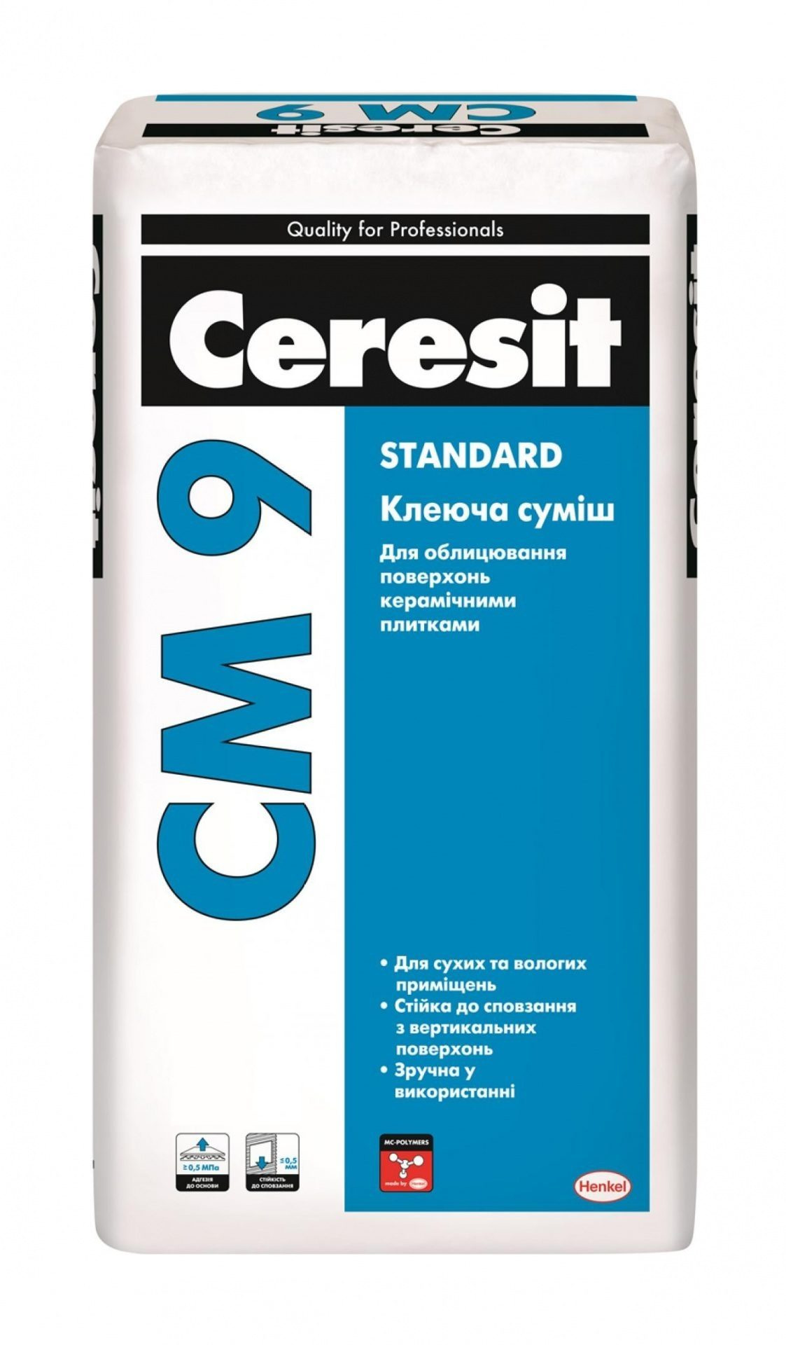 Фасовка: 25 кг. Расход: 2...7.8 кг/м2. Клеевая смесь Ceresit CM 9 Standard 25 кг отвечает всем международным нормам и требованиям. Создает надежное соединение, обладает высокой прочностью сцепления с основанием.