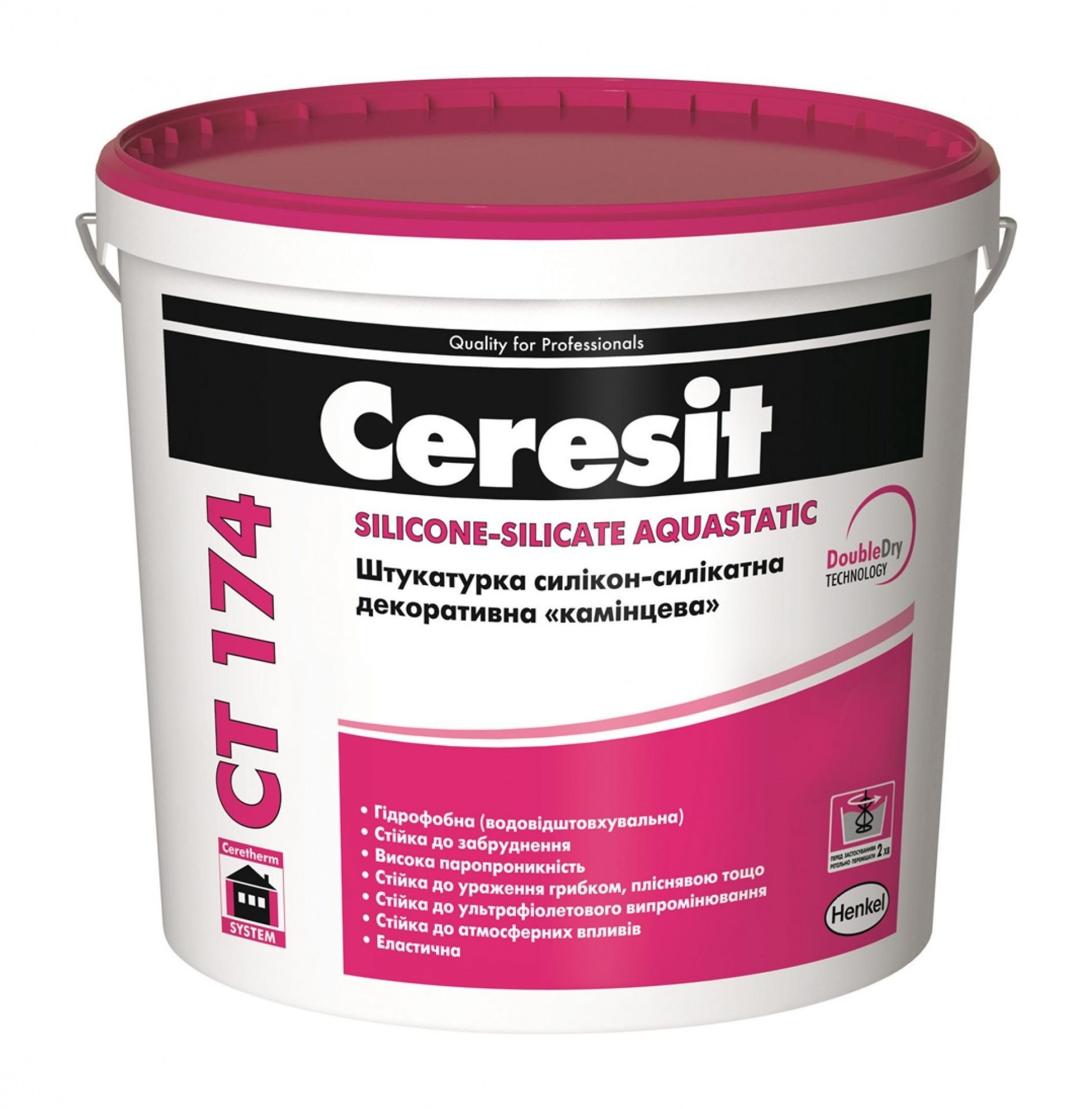 Характеристики товара Штукатурка декоративная Ceresit CT 174 силикон-силикатная камешковая 1,5 мм База C 25 кг