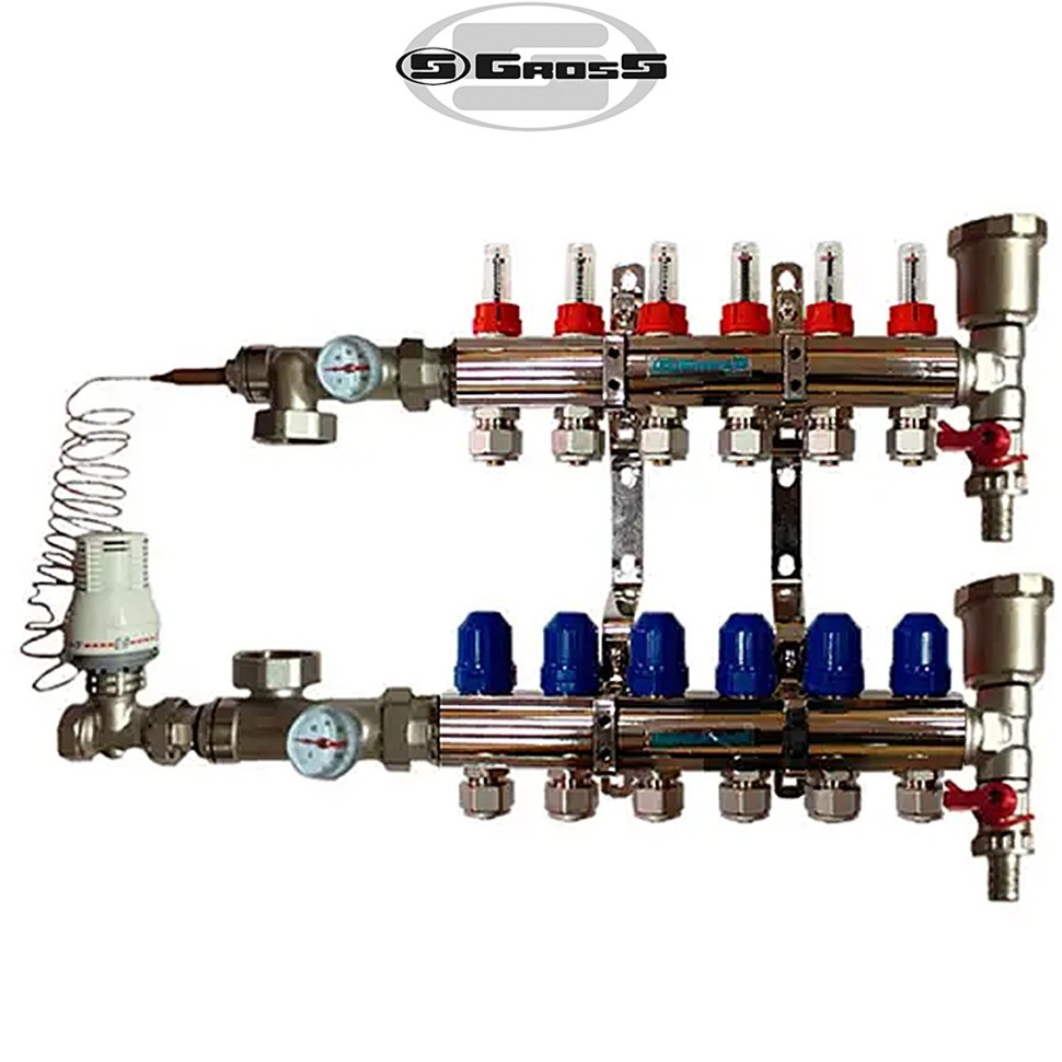 Розподільний колекторний вузол GROSS використовують для регулювання подачі теплоносія в системах та підлогового опалення. Трубопровід кожного з контурів радіаторного або опалення підлоги підключають до окремої пари приєднувальних штуцерів розподільника, що дає можливість регулювати витрату теплоносія, а, відповідно, і теплову потужність системи в кожному приміщенні будівлі індивідуально.