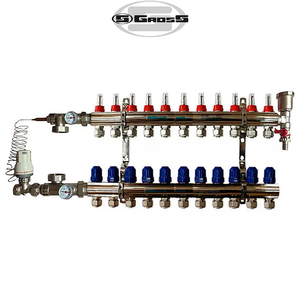 Розподільний колекторний вузол GROSS використовують для регулювання подачі теплоносія в системах та підлогового опалення. Трубопровід кожного з контурів радіаторного або опалення підлоги підключають до окремої пари приєднувальних штуцерів розподільника, що дає можливість регулювати витрату теплоносія, а, відповідно, і теплову потужність системи в кожному приміщенні будівлі індивідуально.